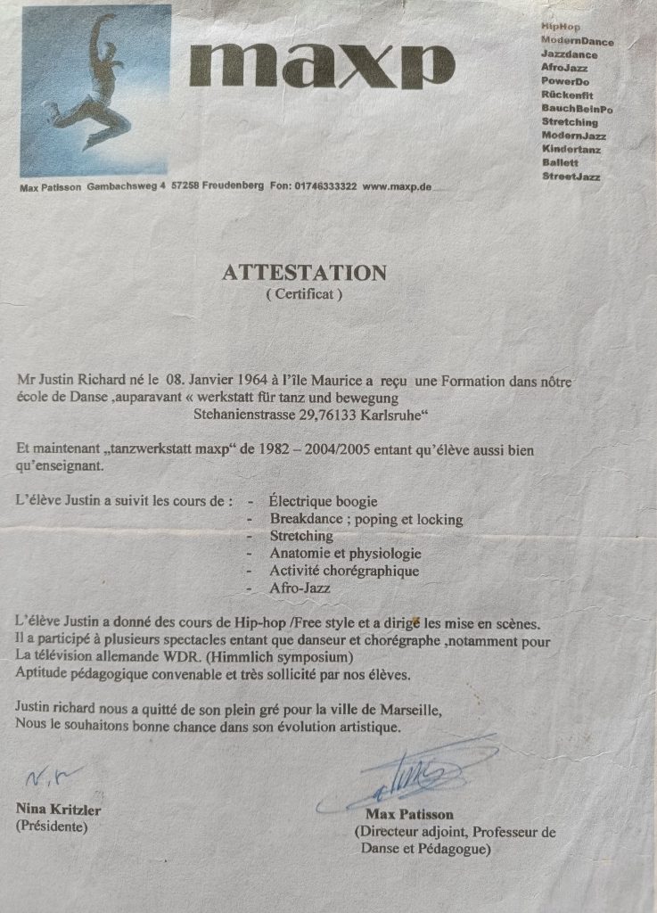 J’ai été formé dans l’école de danse Tanzwerstatt Patisson à partir de 1982 puis enseignant dans cette école en 2004-2005. Je participai aux shows et spectacles avec des professeurs de l’école de danse, et des spectacles en dehors de l’école dans des événementiels toujours avec mon professeur Max Patisson et ses élèves, présentation-spectacle sur des défilés de mode professionnels, avec les vêtements des magasins.